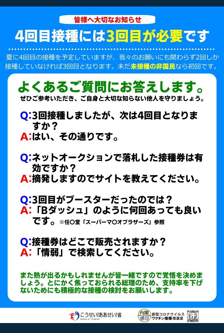打ったあと熱が出るだけじゃなく、ヤバい副反応が一生続きそうなの分かってきたからビビってんのか?さっさと4回目!
