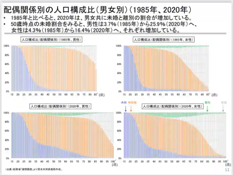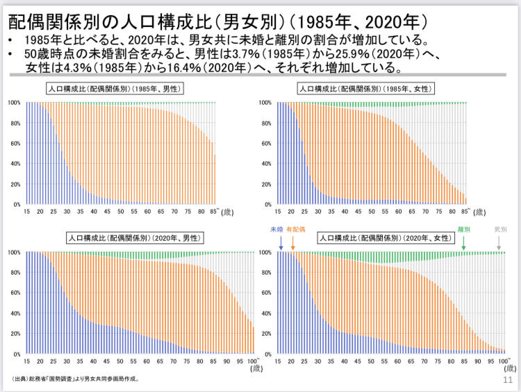 2020年時点で45歳から49歳の未婚率は男性が29.9%、女性が19.2%に達していて上世代と比較して突飛